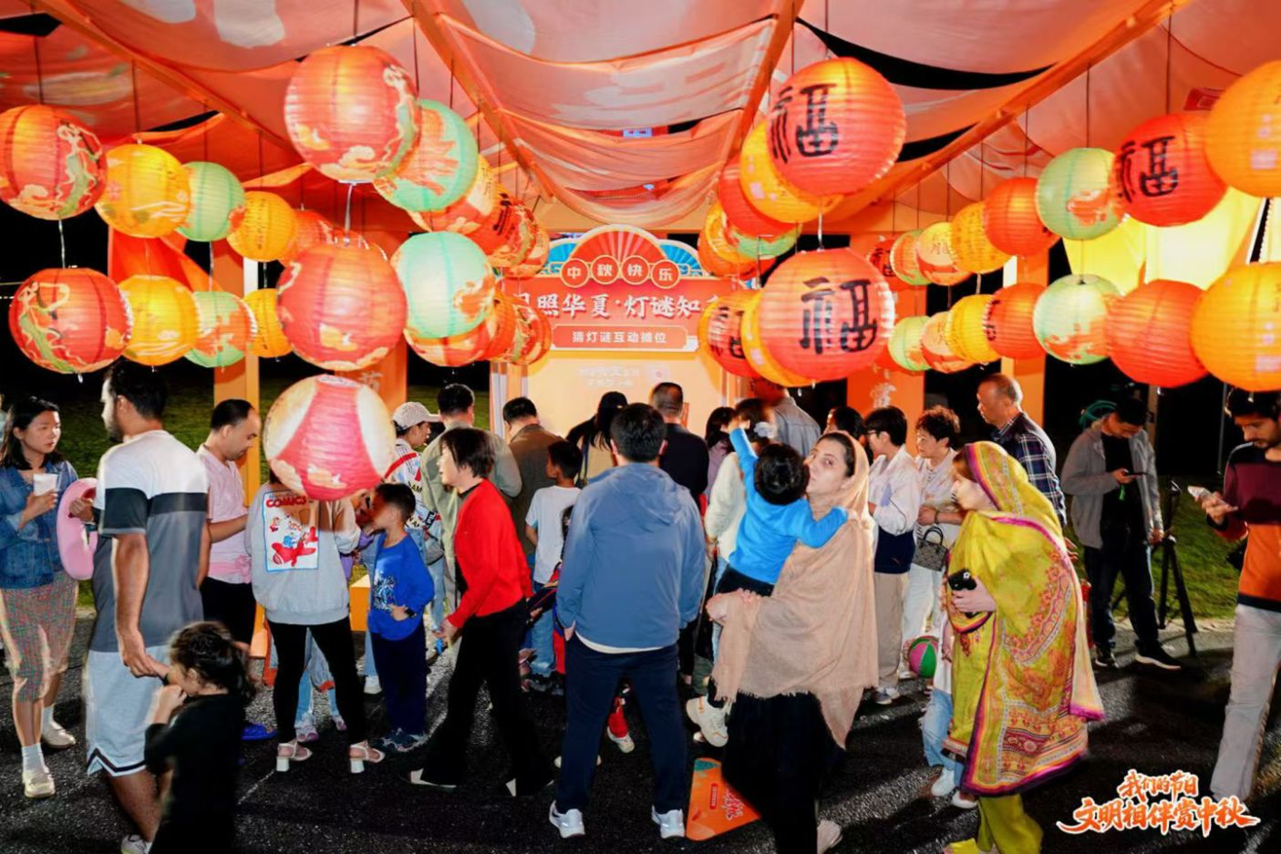国庆假期,成都天府新区秦皇湖畔华灯初上,“我们的节日·文明相伴赏中秋”主题文明实践活动在月光下启幕。市民们或与湖面月亮装置打卡互动、或在非遗箫声中笑猜灯谜,度过了一个别开生面的“水上中秋”。
