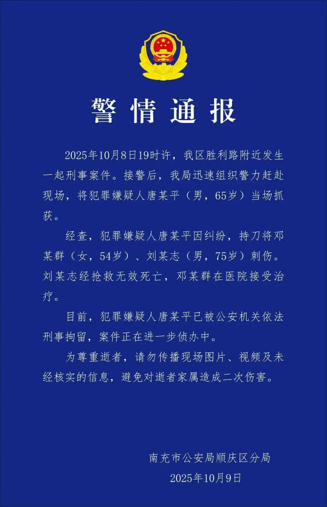 南充65岁男子持刀行凶致一死一伤,警方通报:已刑拘