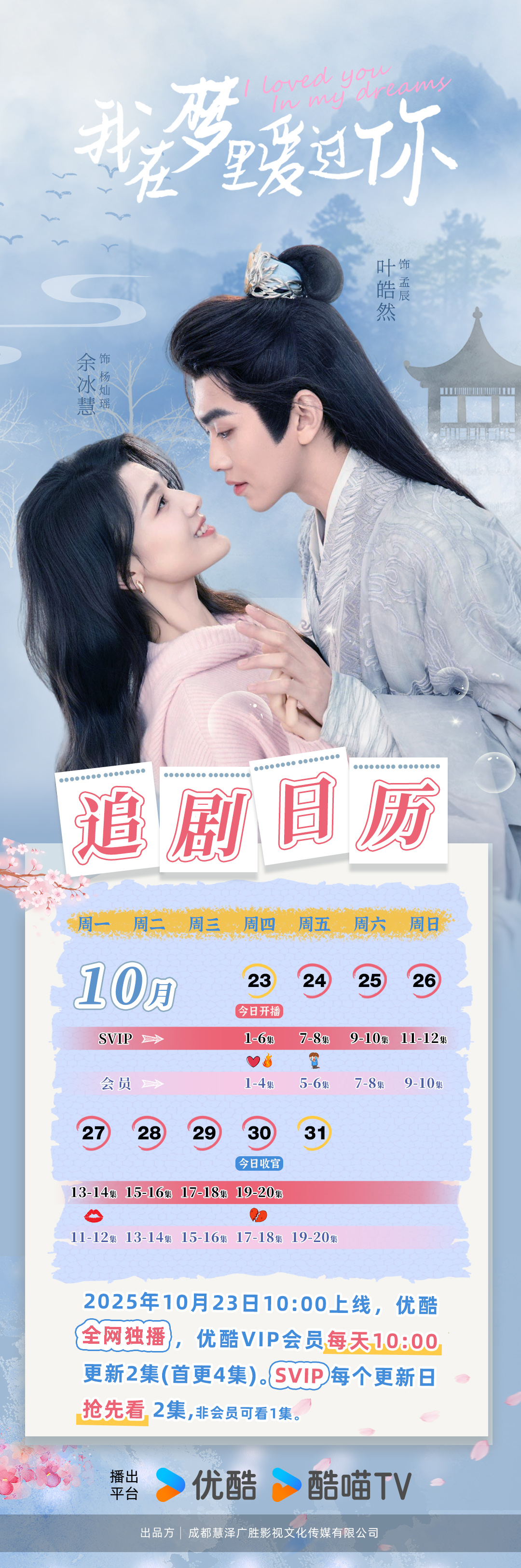 目前,剧集已在优酷平台正式开播,每日 10:00 更新 2 集。会员福利同步开启:VIP 会员首更 4 集,后续连更 9 天即可直通大结局;SVIP 会员享专属特权,首更 6 集,连更 8 天便能解锁全剧内容。感兴趣的观众可即刻登录优酷,沉浸式体验这场跨越千年的奇幻爱情故事。