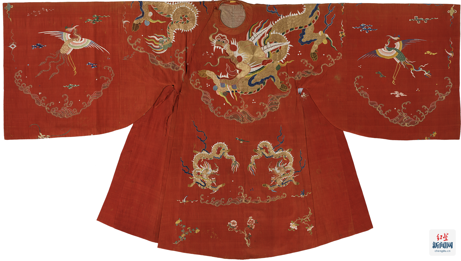 ▲大红色绸绣过肩麒麟鸾凤纹女袍 明 山东博物馆藏