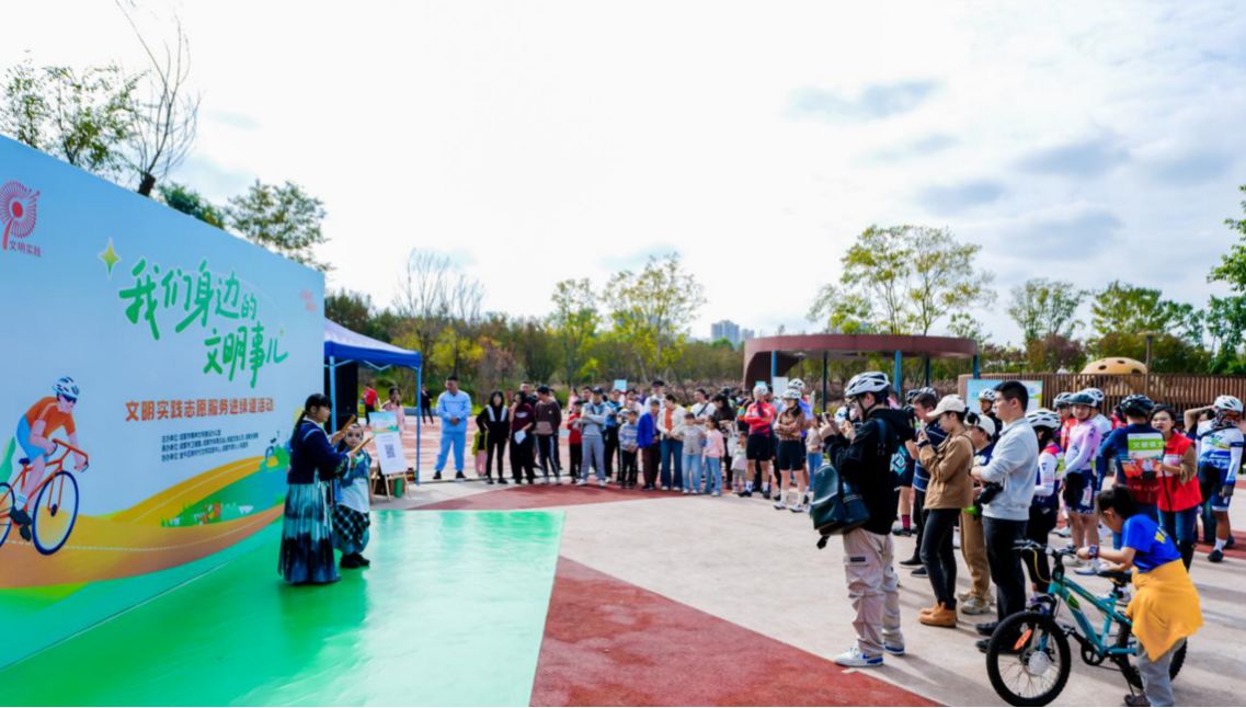 这是“我们身边的文明事儿”文明骑行倡导周出发日活动现场,活动由成都市精神文明建设办公室主办,成都市卫健委、成都市体育总会、绿道文旅公司、成都全搜索承办,金牛区新时代文明实践中心、成都市第七人民医院协办。