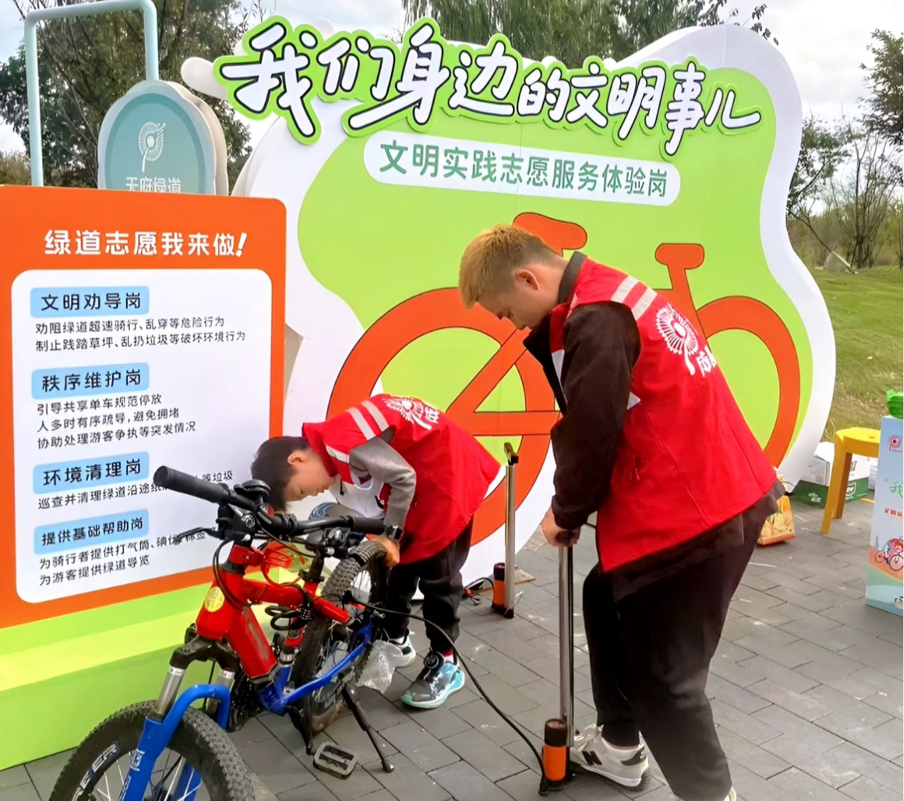 在双流悦动彩林段文明驿站,市民邹佳在完成简短的志愿服务培训后,身着红色志愿者马甲正式“上岗”。他为有需求的市民提供车辆补气、骑行路线导览等便民服务,并协助清理驿站周边环境。经过半小时的志愿服务,邹佳获得“文明护航包”。他表示,后续骑行途中将继续践行“随手文明”,为其他骑行者提供力所能及的帮助。