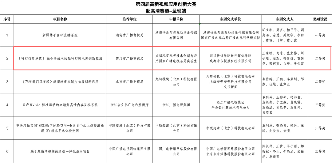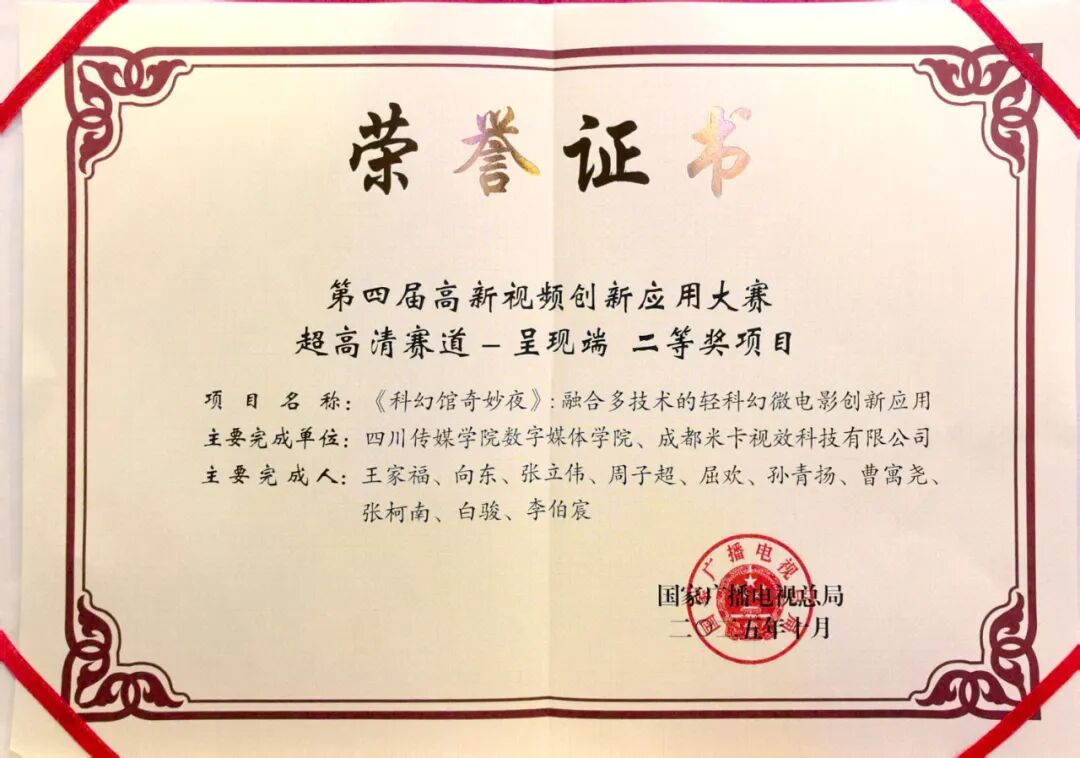 10月28日,2025年中国广播电视精品创作大会及广播电视精品创作大会超高清论坛在京举办。论坛发布了国家广播电视总局高新视频创新应用大赛评选结果。由四川省广播电视局指导,四川传媒学院、虚拟现实视听技术国家广电总局实验室、川传超高清中心创作完成的融合多技术的沉浸式超高清轻科幻微电影创新应用作品《科幻馆奇妙夜》荣获国家广播电视总局第四届高新视频创新应用大赛超高清赛道二等奖。同时该获奖成果转化在虚拟现实视听技术国家广电总局实验室光影馆及省重点文产项目-巴中影视硅谷(恩阳)科普大视界8K环幕展映,两个馆观影量已突破100余万人次。