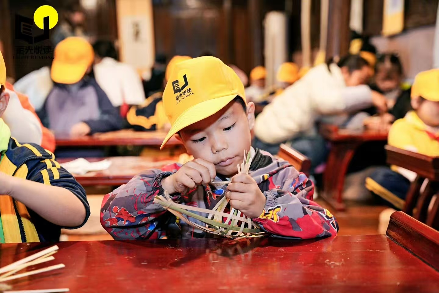 在民俗与非遗体验环节,老师指导大家分组尝试酿酒、榨油、拓印等传统项目。从了解原料特性到动手操作工具,孩子们全神贯注,在亲身实践中感受传统技艺的巧妙与古人的生活智慧。随后的非遗竹编手工体验更是让现场充满欢声笑语,老师一步步拆解编织技巧,孩子们耐心学习、相互协作,一根根普通的竹丝在手中逐渐变成精美的小物件。这一环节不仅锻炼了孩子们的动手能力,更让他们体会到了非遗文化的匠心传承。
