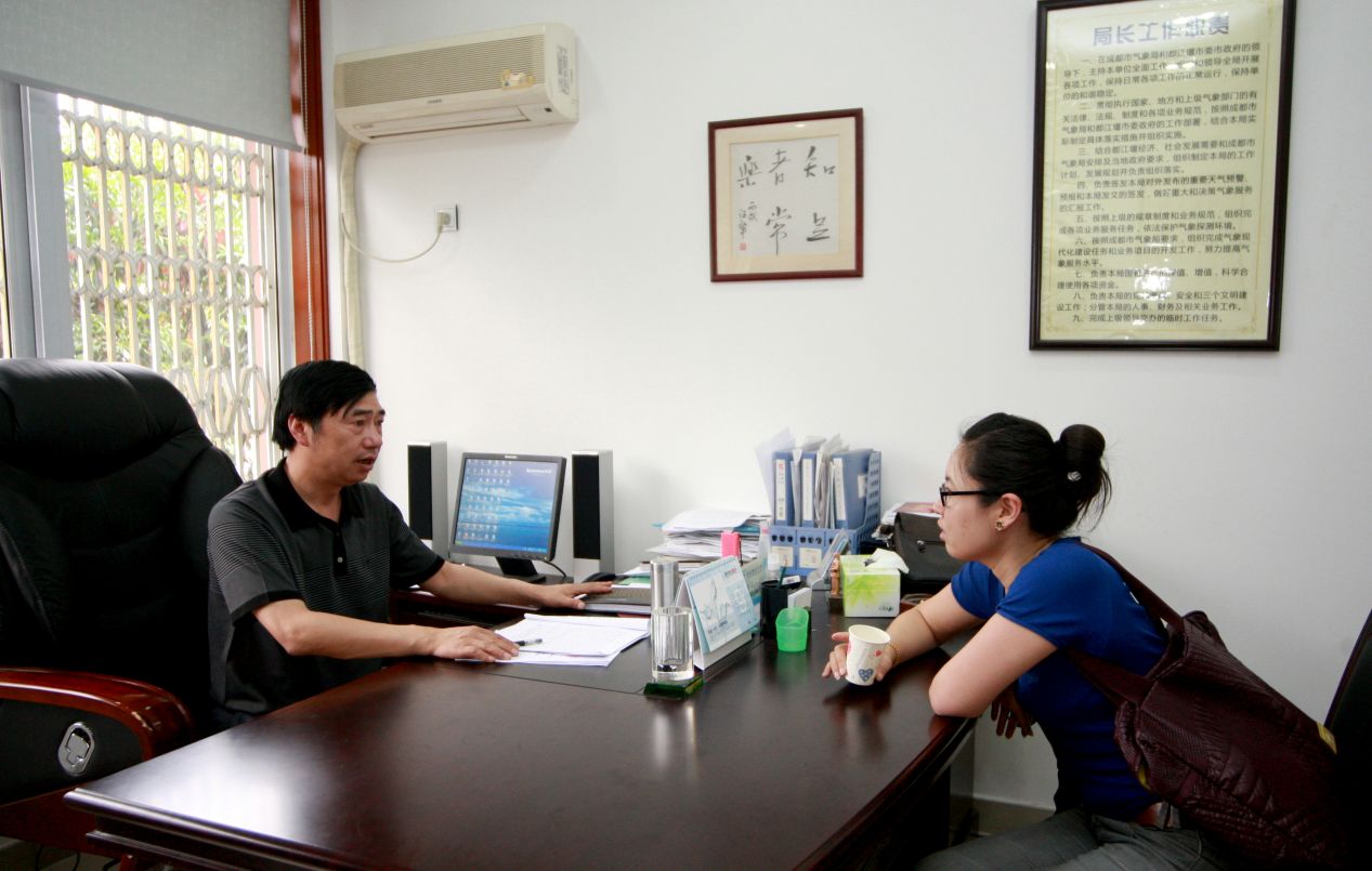 (2011年,闵永太在都江堰市气象局接受记者采访)