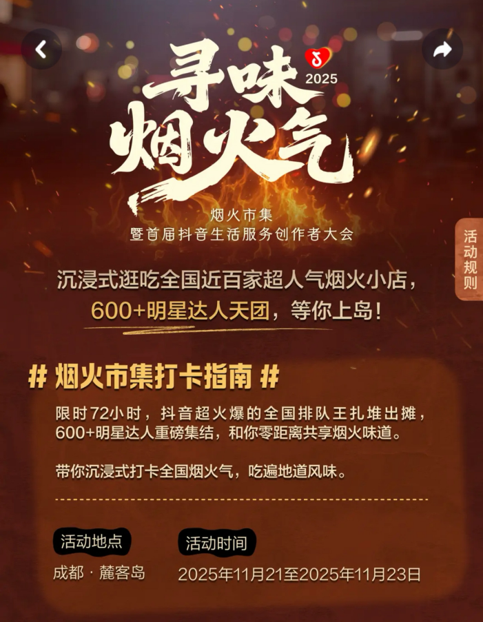 活动期间,抖音生活服务平台将在成都首次发布官方认证的“烟火榜”,为广大市民和游客提供一份具有公信力的美食指南,助力成都美食文化的传播与推广。与此同时,现场还将迎来超600位明星达人,与市民游客亲切互动,共同品味人间烟火,传递城市温情。
