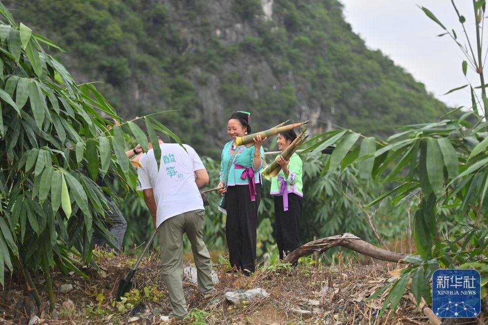 ▲在广西柳州市柳江区成团镇六道村,乌英苗寨妇女梁足英(中)、吴妹富(右)和企业负责人在采摘竹笋(6月28日摄)。