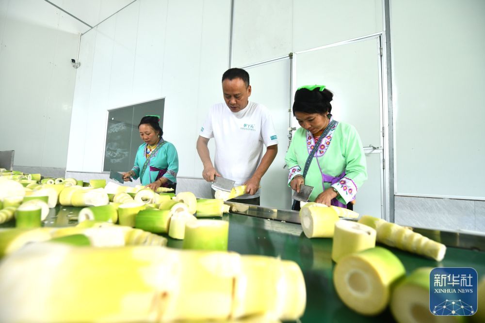 ▲在广西柳州市柳江区成团镇六道村一家农业公司生产车间,乌英苗寨妇女梁足英(左)、吴妹富(右)在加工竹笋(6月28日摄)。
