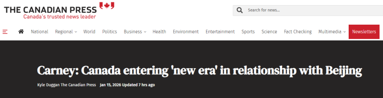 加拿大总理卡尼1月14日至17日对中国进行正式访问。1月16日,中加两国领导人会见,多家外媒高度关注。