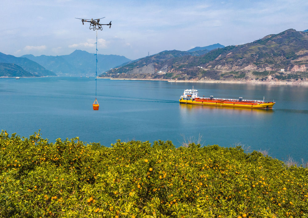 ▲2025年3月17日,湖北省秭归县郭家坝镇邓家坡村村民用无人机转运脐橙(无人机照片)。新华社发(郑家裕摄)