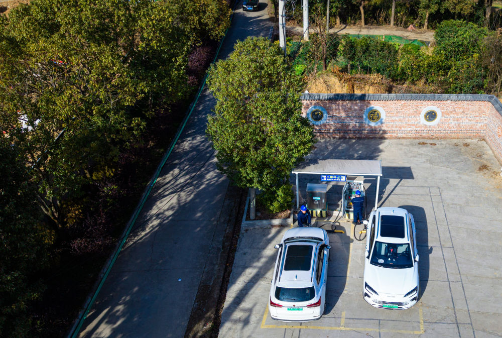 ▲2026年1月11日,国网鄂州供电公司工作人员对鄂州市鄂城区西山街道小桥村充电站的充电设备进行巡检(无人机照片)。新华社记者 肖艺九 摄
