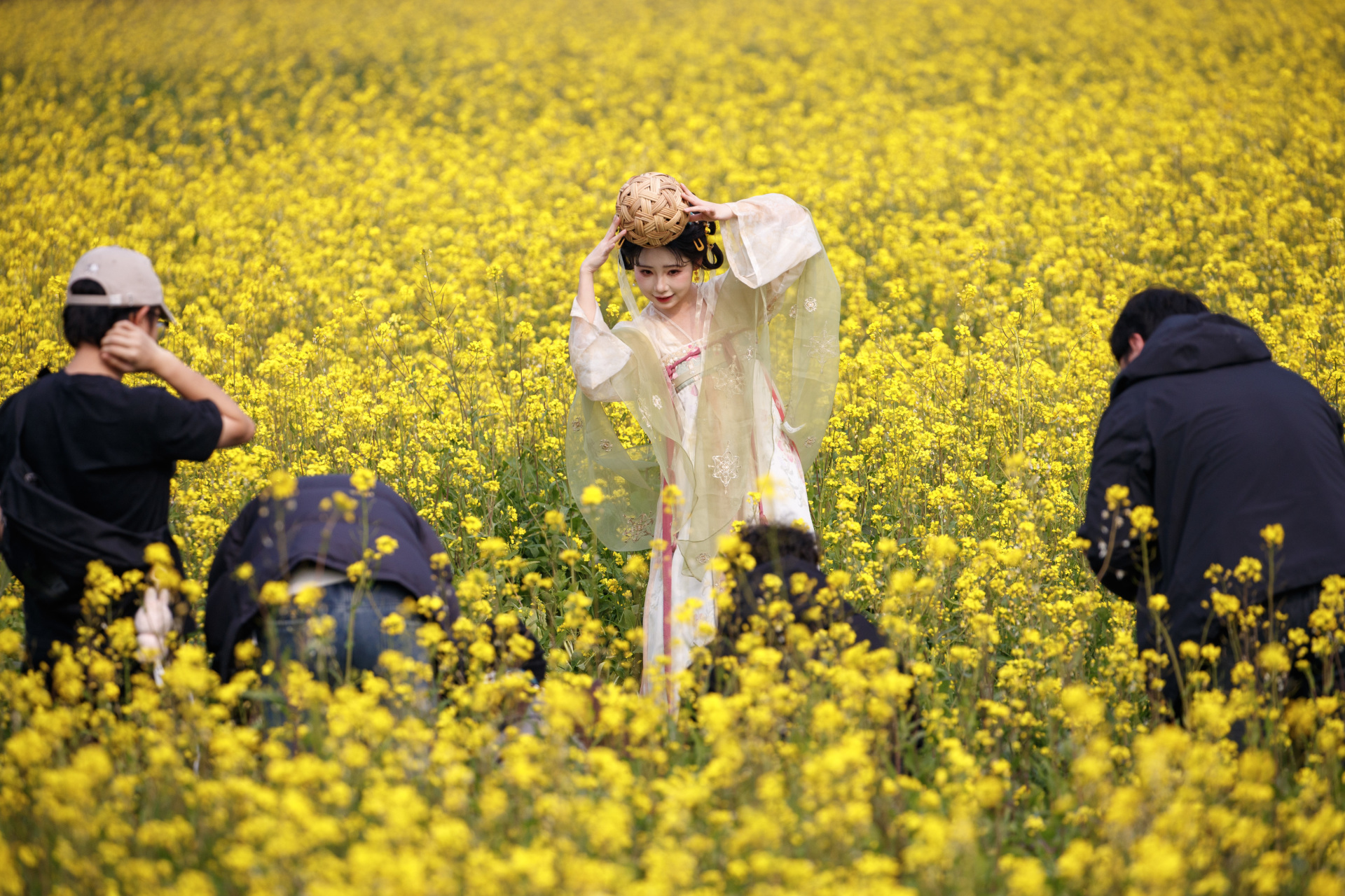 现场最热闹的莫过于拍照打卡的人群,其中年轻人的热情丝毫不输各位孃孃,成为花海中一道亮眼的风景线。这边几位穿着时尚的年轻人,他们带着专业的设备,丰富的道具,做好了十足的准备,时不时交流拍摄技巧,力求定格每一个绝美瞬间;那边一群孃孃们则身着色彩艳丽的服饰,带着丝巾、帽子等道具,在花田中央摆出整齐的姿势,脸上洋溢着灿烂的笑容,快门声此起彼伏。还有不少骑行爱好者特意绕道而来,停下单车在花海旁留影,将运动的活力与花海的柔美融为一体。
