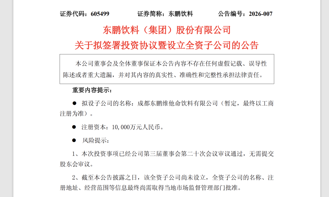 同时,公司计划在成都市温江区注册设立全资子公司成都东鹏维他命饮料有限公司,注册资本为1亿元,专项负责该基地项目的推进与实施。