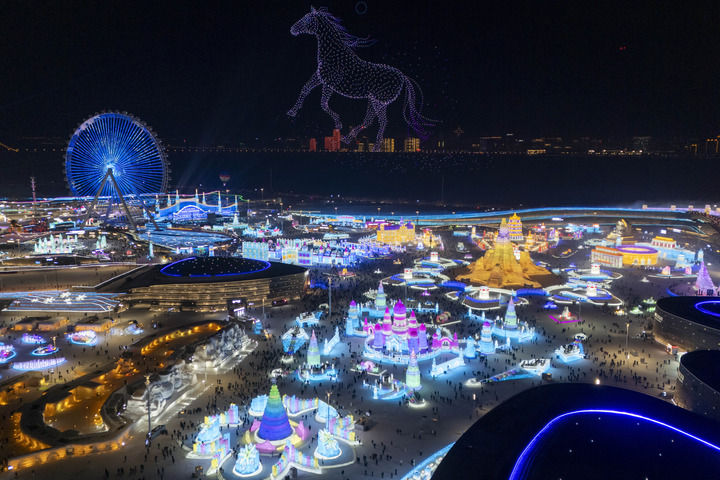 ▲这是2026年1月5日拍摄的哈尔滨冰雪大世界园区的无人机表演(无人机照片)。新华社记者 张涛 摄