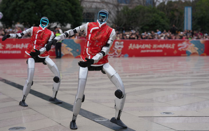 ▲2026年2月28日,宇树科技人形机器人在浙江省桐庐县中心广场表演舞蹈。新华社记者 黄宗治 摄