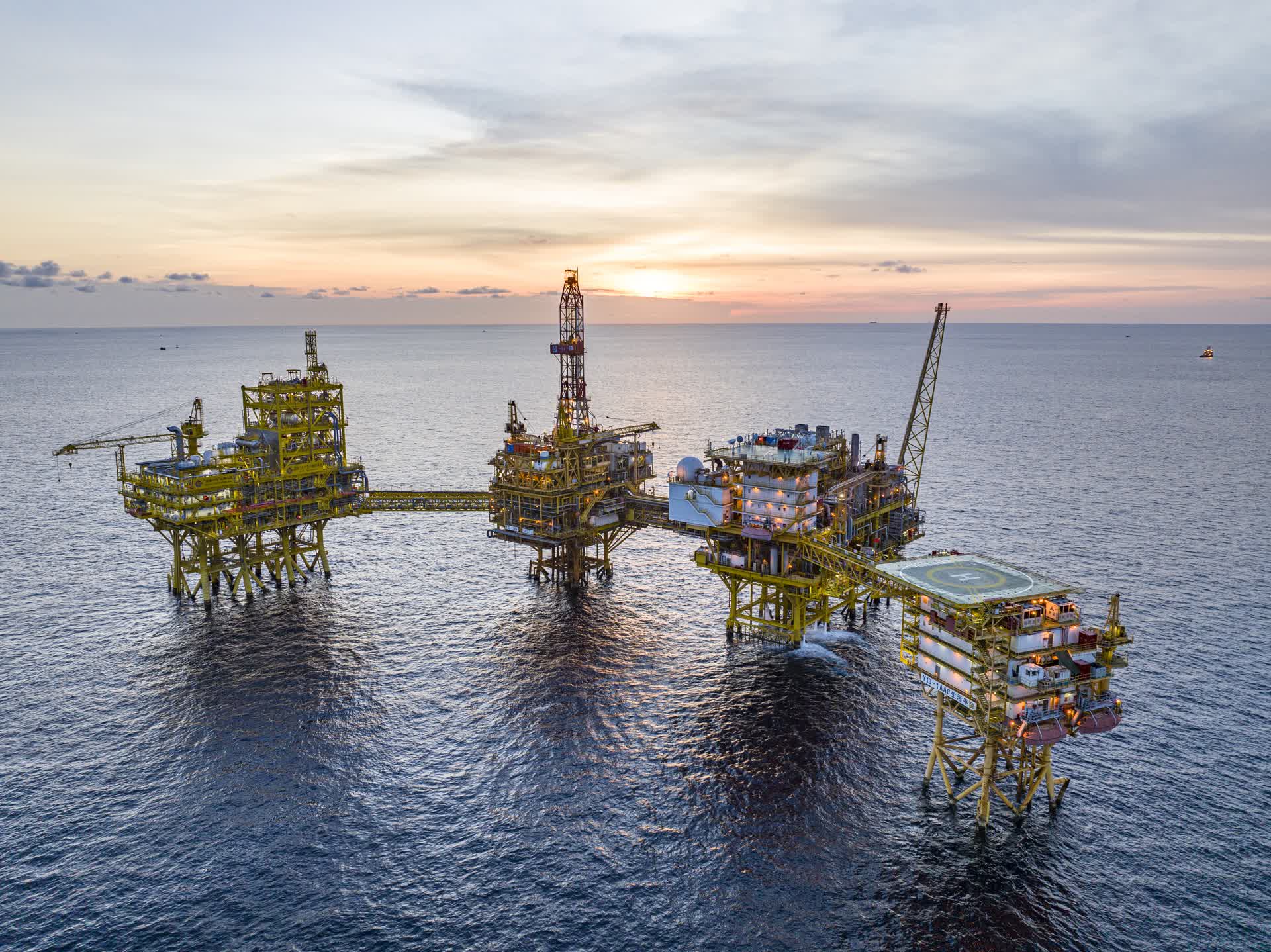 图为朝霞中的“四星连珠”平台群,其由新建的“深海一号”二期综合处理平台和崖城13-1气田原有平台组成。李浩玮摄