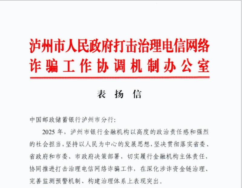 筑牢金融反诈防线,邮储银行泸州市分行反诈工作获表扬